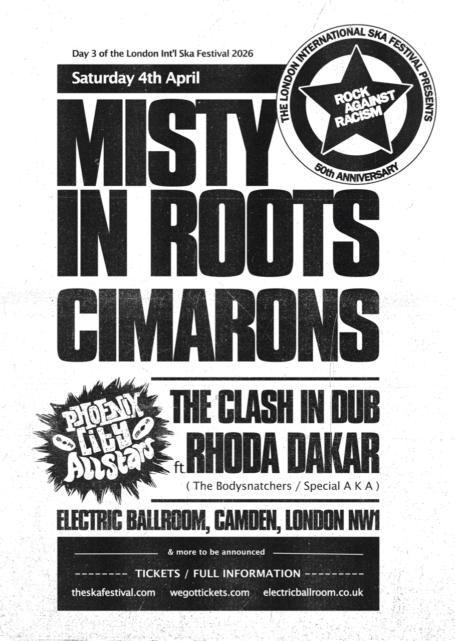 Phoenix City All-stars make an exclusive live premiere of their critically acclaimed Clash in Dub album – ‘Clash Version Rockers’ plus other hits of ‘the only band that mattered’.  Guesting with them is 2 Tone/The Bodysnatchers/Special AKA star – Rhoda Dakar, who, as well as co-writing Free Nelson Mandela, performed with The Specials at Leeds Rock Against Racism alongside Misty In Roots!