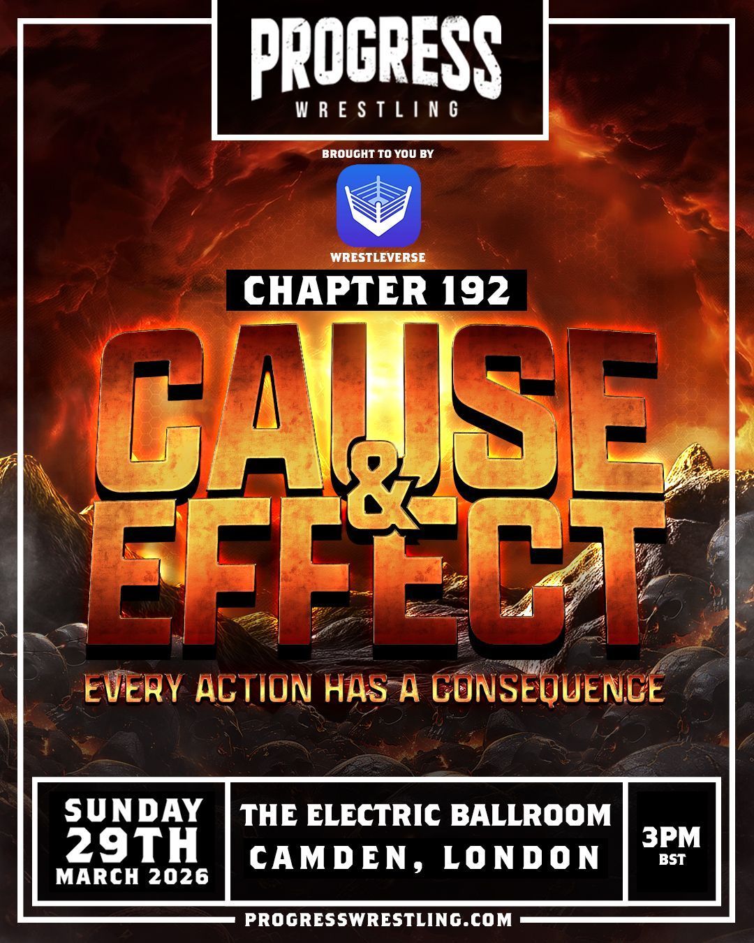 PROGRESS now present Chapter 192: CAUSE & EFFECT – with many of the finest UK professional wrestlers. A few weeks before PROGRESS travel to Las Vegas for the WrestleMania weekend, who will roll the dice and be contenders for wrestling’s biggest weekend?