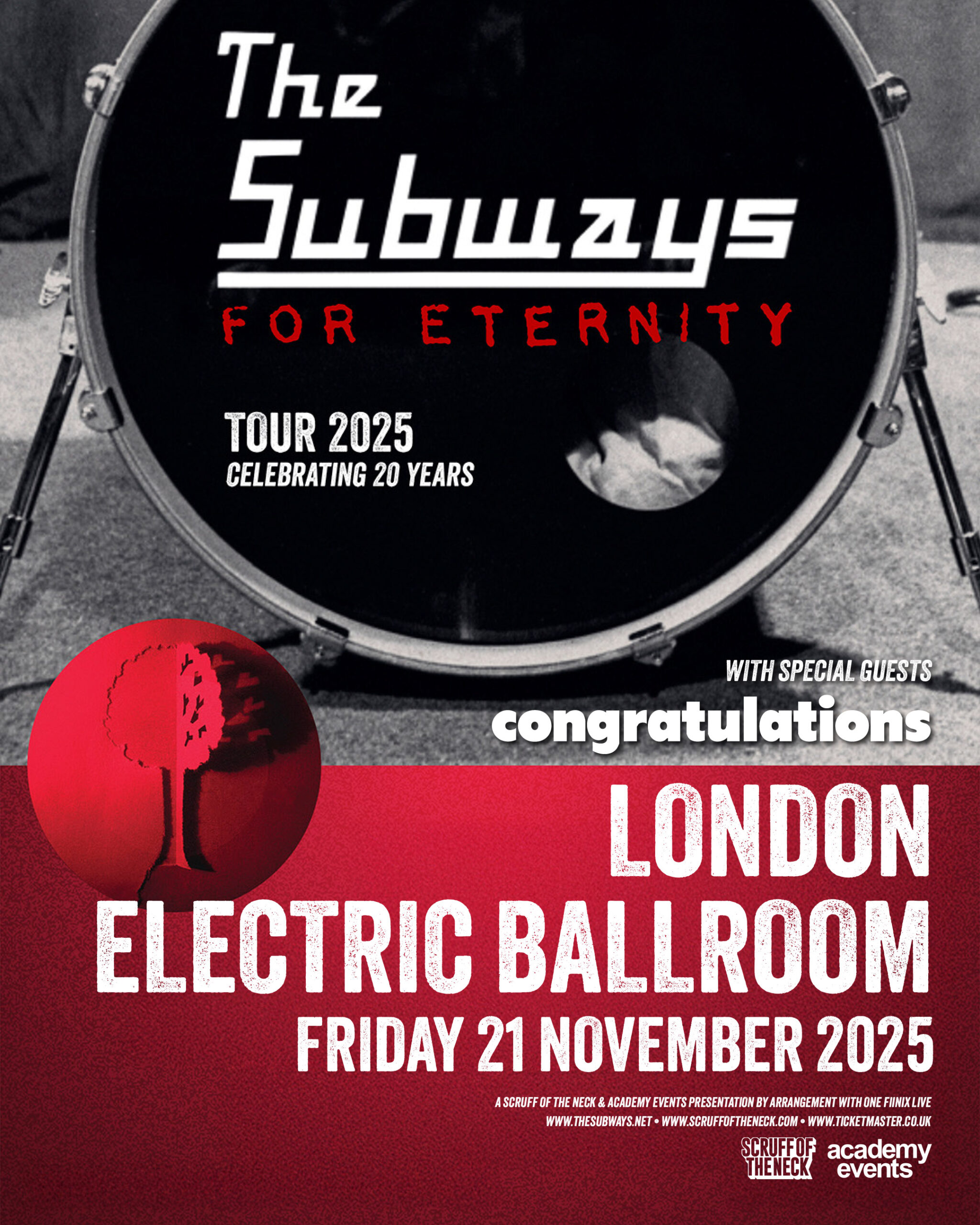 In 2005, teenage trio The Subways made a phenomenal breakthrough with their Gold-certified debut album ‘Young For Eternity’. It set them on the road to an endless succession of highlights, including their iconic ‘Rock & Roll Queen’ becoming a mainstay of rock radio and streaming playlists (with 100 million+ streams to date) extensive global headline tours, with a running total of 1059 gigs across 40+ countries.